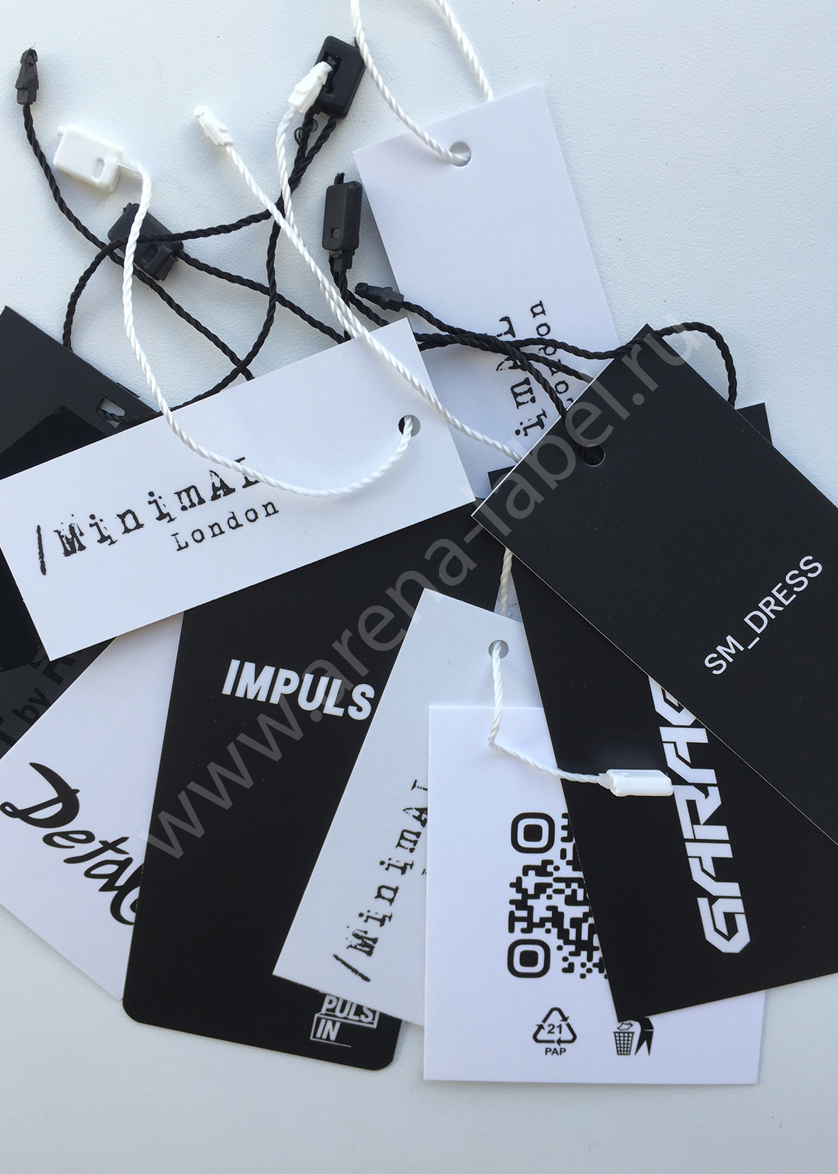 Картонные ярлыки на заказ. Черно-белая классика. Для воплощения любых Ваших идей – предлагаем широкий ассортимент бумаги и большой выбор технологий. Офсетная, цифровая печать, шелкография, матовая или глянцевая ламинация, выборочный лак, вырубка и каширование. Являясь частью фирменного стиля, навесной ярлык так же содержит полную информацию об уходе за изделием и производителе. Сделайте его ярким и запоминающимся